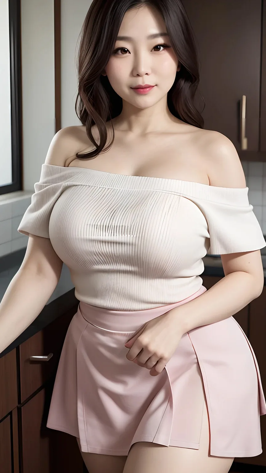 A graceful woman stands in a modern kitchen, wearing an off-shoulder white top paired with a soft pink skirt. Her dark, wavy hair frames her gentle face, and she poses with confidence and poise. The warm lighting and neutral background create a calm, sophisticated atmosphere.