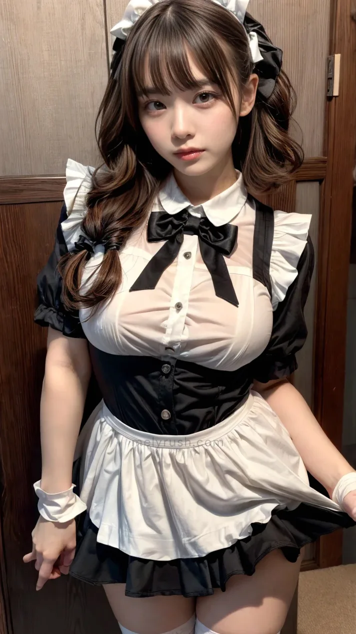 A beautiful Asian girl poses indoors wearing a traditional black and white maid outfit with ruffled details and a matching headpiece. Her soft makeup, straight hair with bangs, and composed expression highlight her elegance and charm. The outfit’s classic design and indoor setting create a stylish and captivating cosplay-inspired portrait.