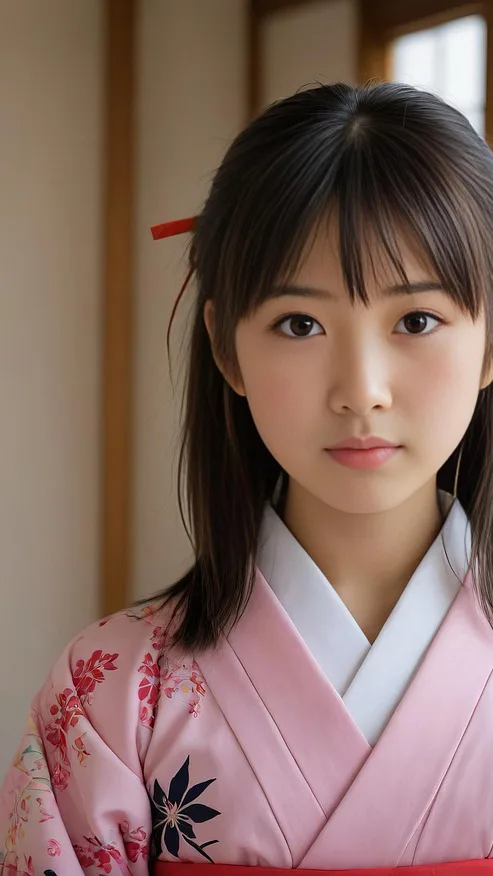 A young woman wearing a delicate pink kimono decorated with floral patterns stands gracefully in front of traditional shoji screens. Her simple hairstyle, adorned with red ribbon ornaments, and her calm, composed expression highlight a serene beauty rooted in Japanese tradition.