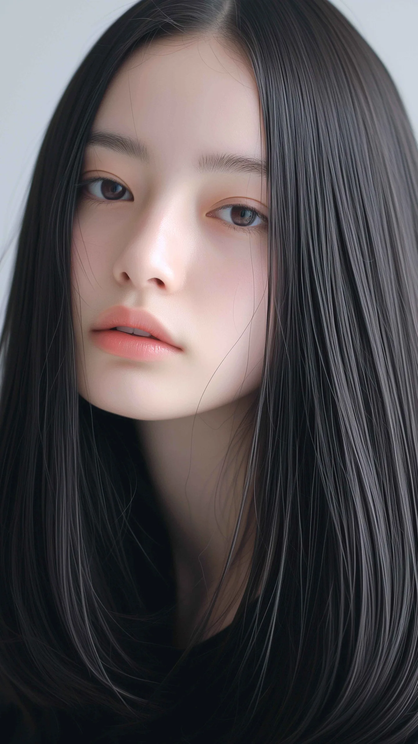 A close-up portrait of a young woman with long, silky black hair and soft, porcelain-like skin. Her calm expression, delicate features, and minimal makeup create a sense of pure elegance and natural charm, highlighted against a simple light background.